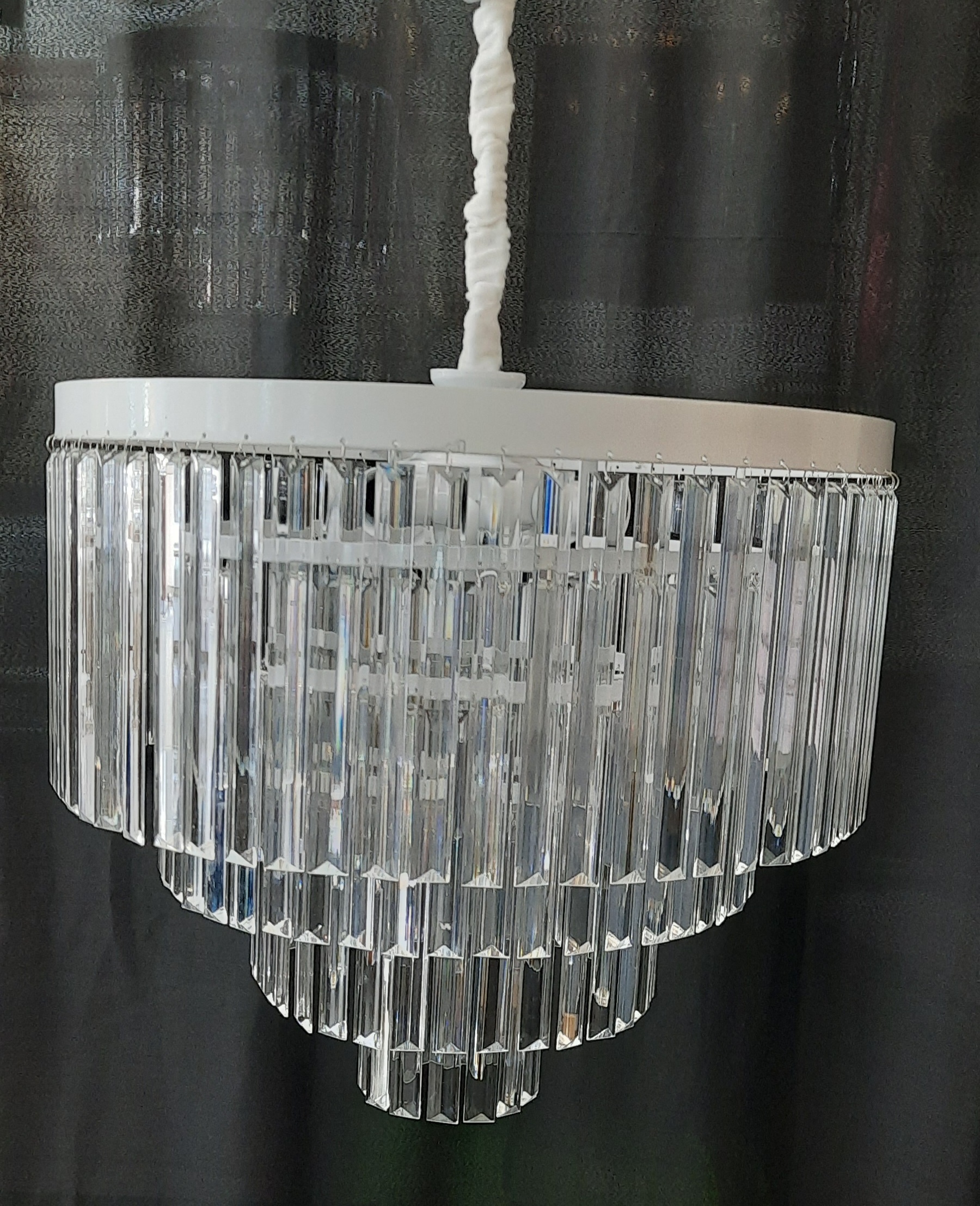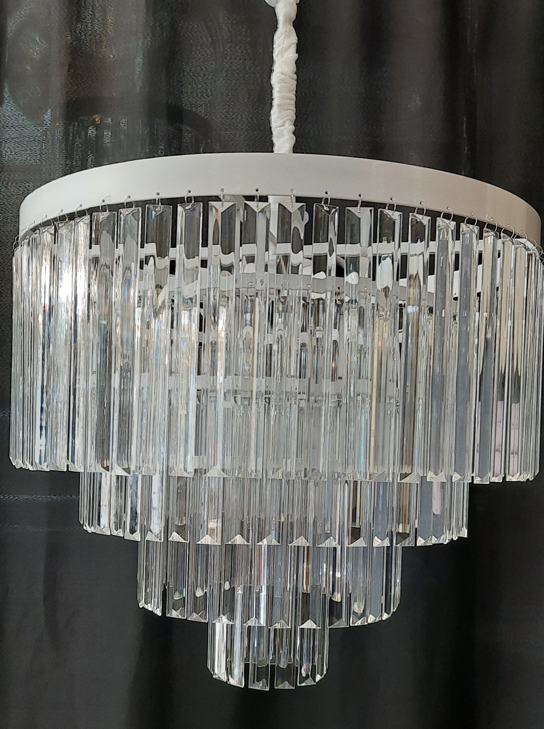 لوستر سایز ۵۰ چهار طبقه رنگ بدنه مشکی سفید طوسی رنگ کریستال سفید جنس کریستال اصلی ۹ شعله شامل ۸ سرپیچ شمعی و یک سرپیچ بزرگ بسیار پر نور